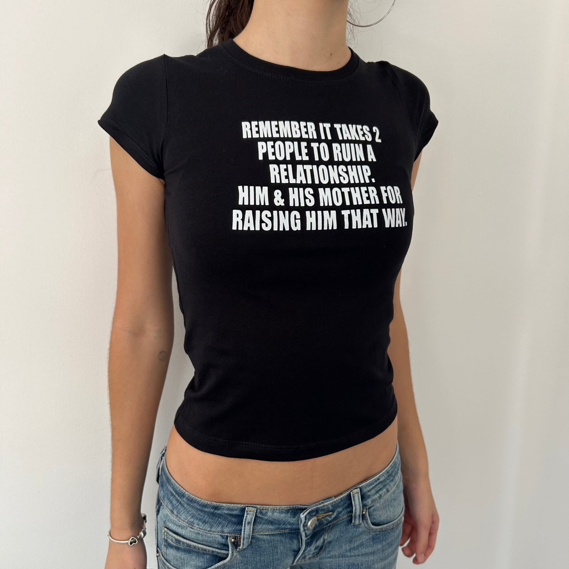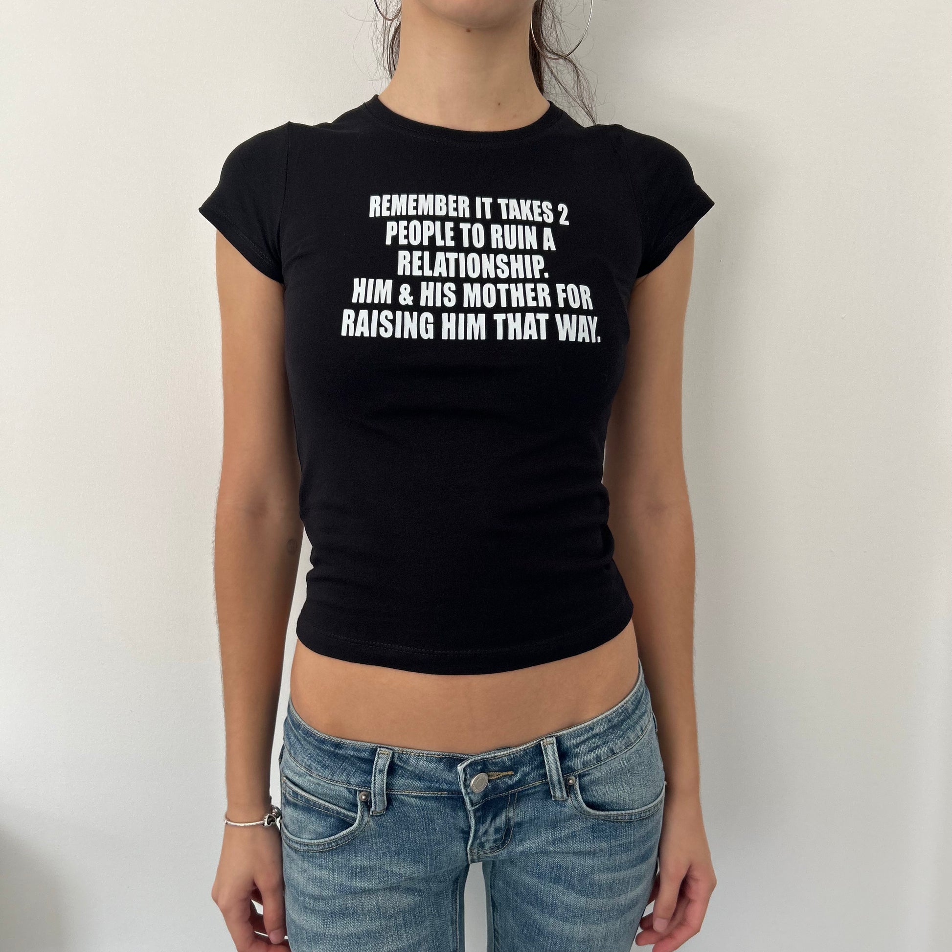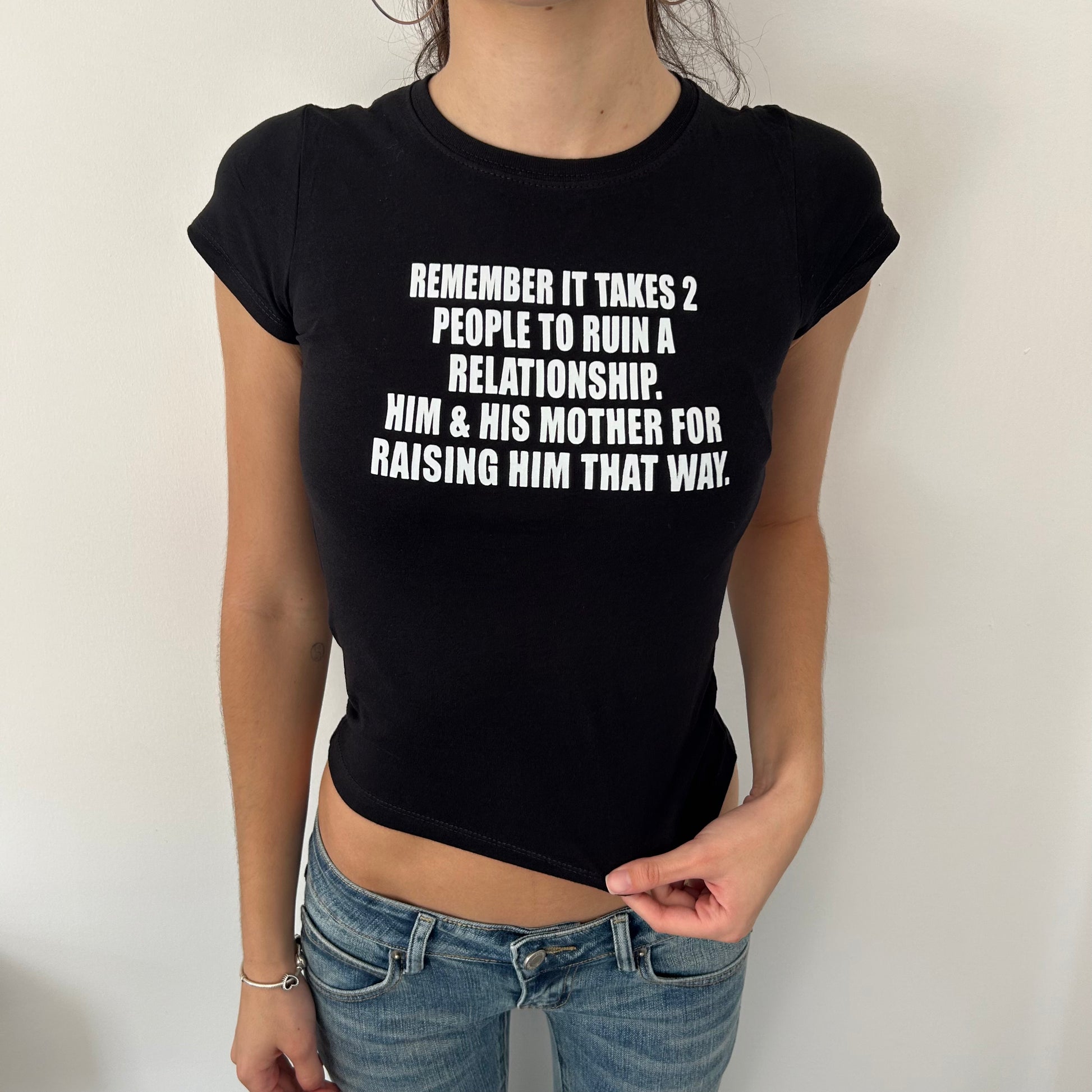 Fitted baby tee in a medium crop length.